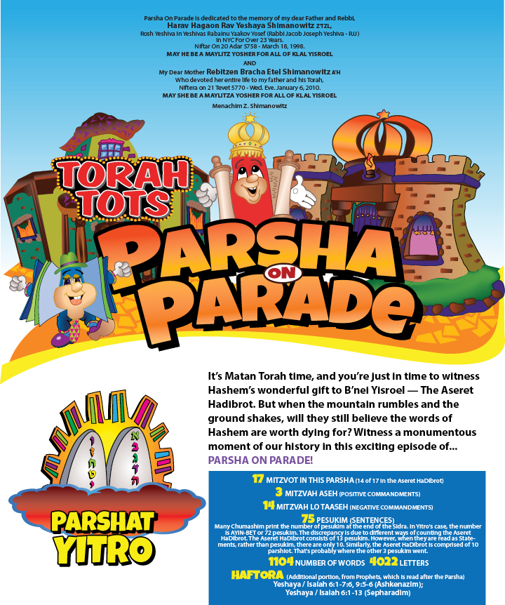 You too can dedicate a Parsha or any other section of Torah Tots in honor or in memory of someone close to you. For further info, click here. Shabbat See the Midrash Mavin on Yitro top of page home | about us | parsha on parade | jewish holidays | learning is fun | hear the music | gift shop | guestbook links | site map "TORAHTOTS" is a trademark of/and © 1996-2025 by TorahTots.com All rights reserved. Email.....info@torahtots.com Designed by R.A. Stone Design Associate and HI-TECH Computers, Inc. (718) 253-9698 Email.....info@hitechcomputers.com Page last updated - 02/02/2025